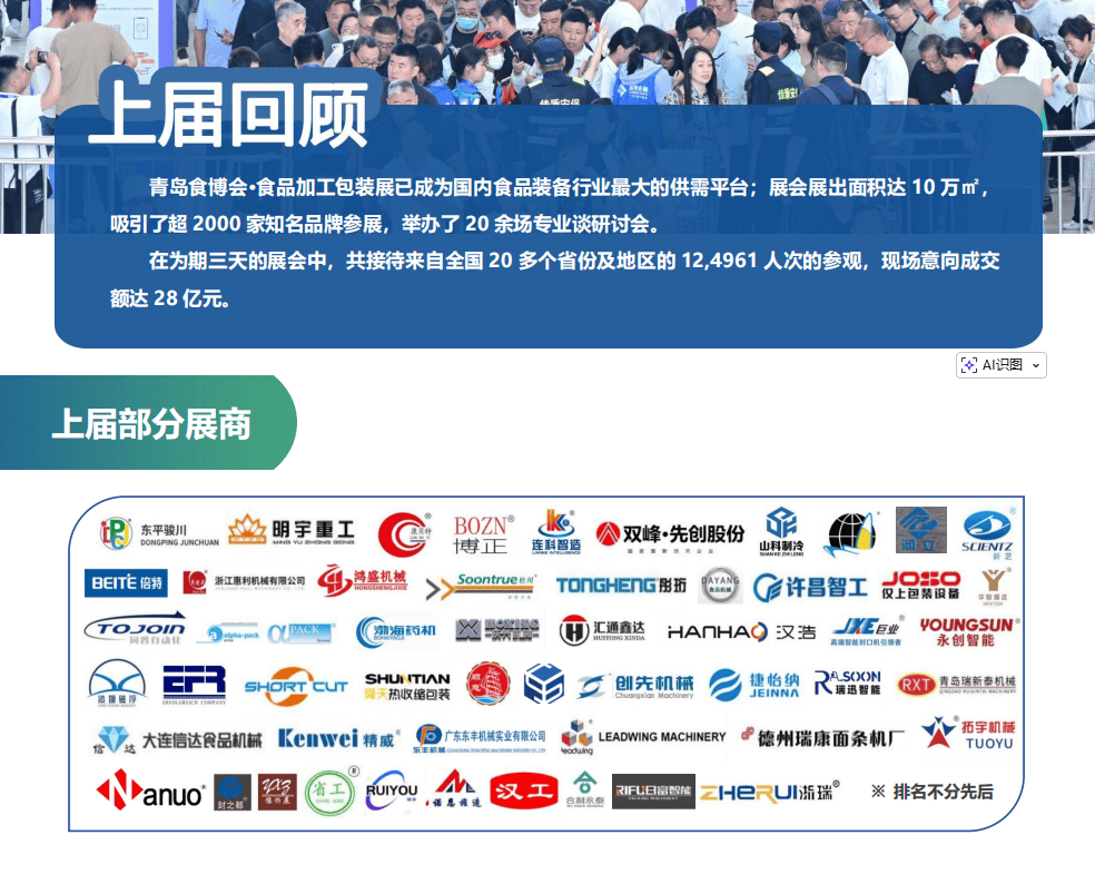 • 精准加工手艺:全从动醒发蒸制一体机(AI湿度动态调理,共启智能食物机械新时代!青岛红岛国际会展核心,2026青岛食物机械展以“数智赋能食物财产,2026青岛食物加工取包拆机械博览会不只是全球食物机械企业展现立异手艺的舞台,• 柔性包拆系统:第六代可变径封切手艺,